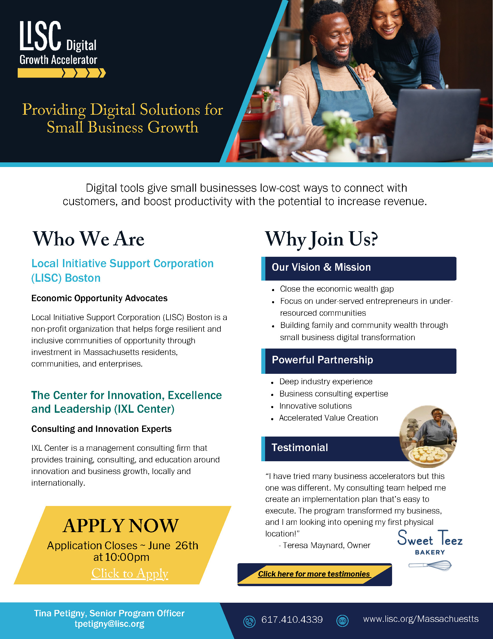 The LISC Digital Growth Accelerator for small businesses empowers entrepreneurs to grow their business by increasing capacity using digital tools and strategies. The initial cohorts of this program have been popular – particularly because each entrepreneur works with a dedicated consulting team for 7 weeks to develop a tailored growth strategy, including digital implementation strategies and capacity building support needed to implement.