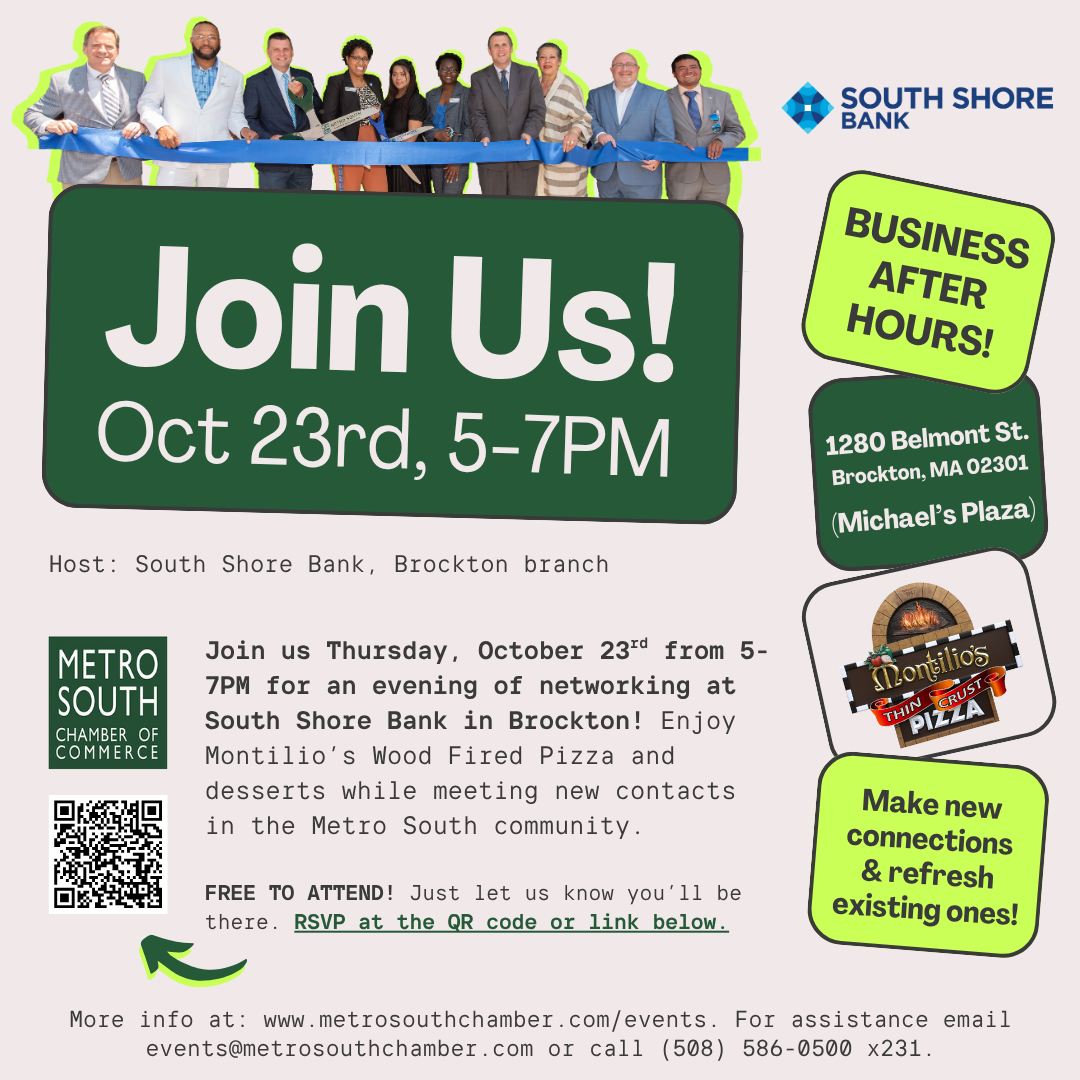 The Metro South Chamber of Commerce is a private, non-profit business association based in the City of Brockton, Massachusetts. The Metro South Chamber of Commerce supports and promotes the local business community through leadership in public advocacy, education, networking, information and community development.