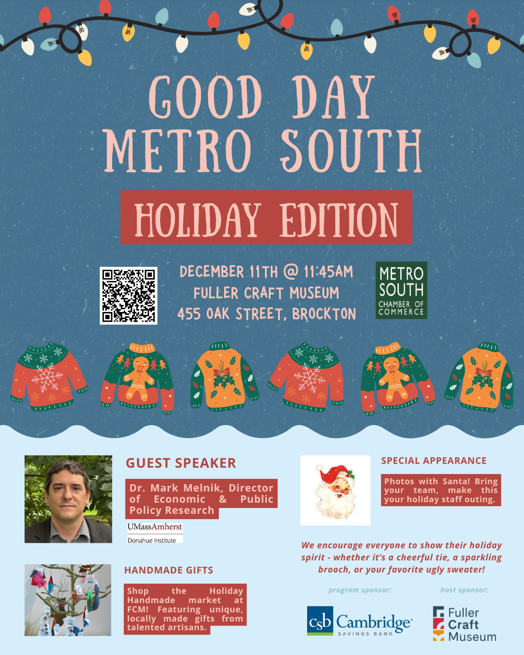 Fuller Craft Museum 455 Oak Street, Brockton, MA, United StatesYou're invited to a special holiday edition of the Chamber's Good Day Metro South luncheon series! Join us Thursday, December 11th at the beautiful Fuller Craft Museum for holiday networking facilitated by Rob Peters Entertainment, photos with Santa, delicious food and an interesting presentation from our guest speaker - Mark Melnik, Director of Economic & […]