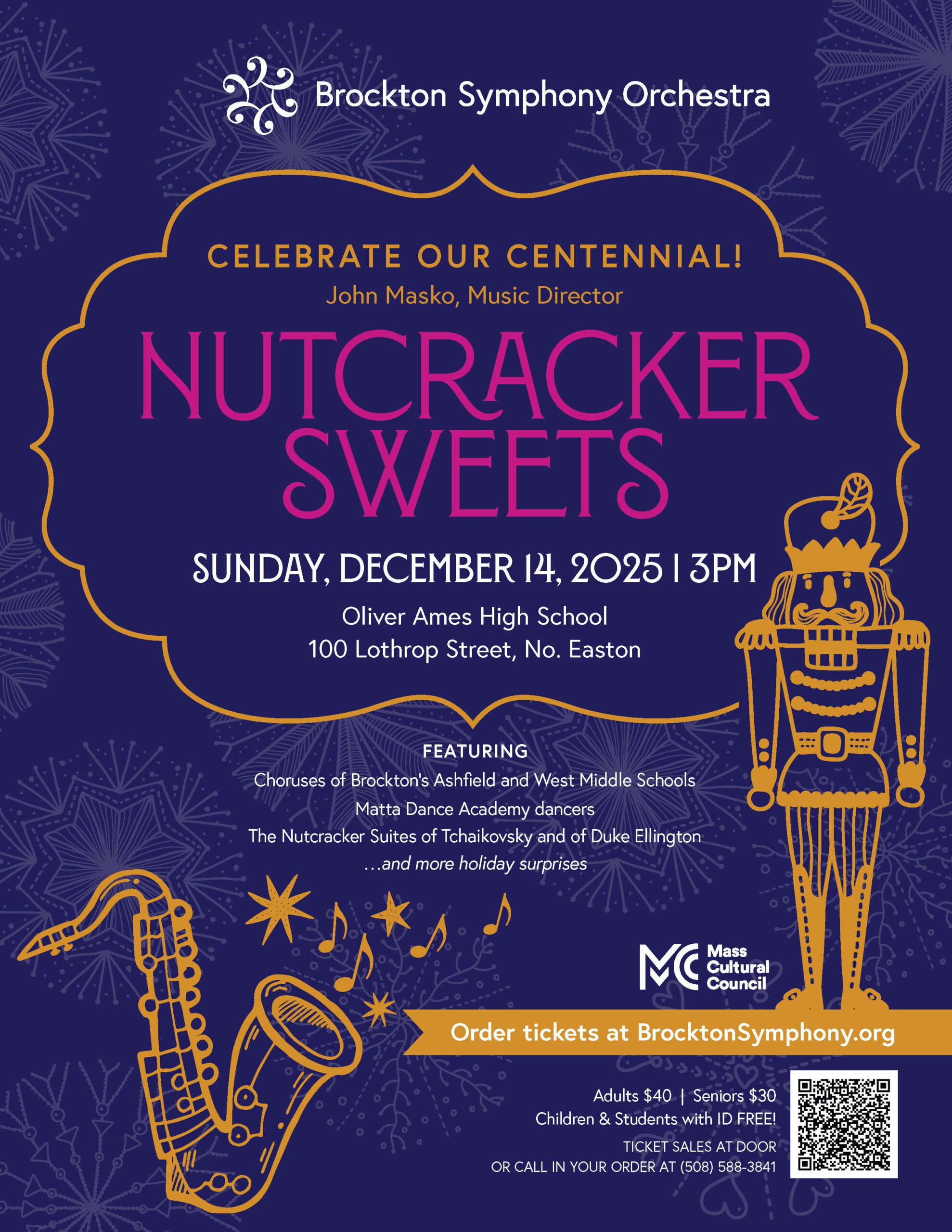 Oliver Ames High School 100 Lothrop St, North Easton, MA, United StatesTreat yourself to the magic of the season! Our annual holiday celebration returns with Tchaikovsky's beloved Nutcracker Suite, paired with the jazzy sparkle of Duke Ellington's swinging take on The Nutcracker, blending classical charm with big band brilliance for a holiday twist that's uniquely sweet. With dazzling dancers from Brockton’s Matta Dance Academy, along with holiday favorites […]